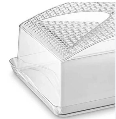 Porta bolo retangular em acrílico com tampa, ideal para conservar e servir bolos. Prática, resistente e de fácil limpeza.