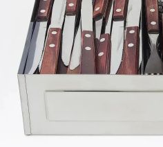 Porta talheres fabricado em aço inoxidável de alta qualidade, resistente e fácil de limpar. Proporciona organização eficiente para talheres em cozinhas, restaurantes e buffets. Medidas: 24x22x8 cm. Cor: Inox. Tags: organizador de talheres, suporte de talheres, bandeja para talheres.