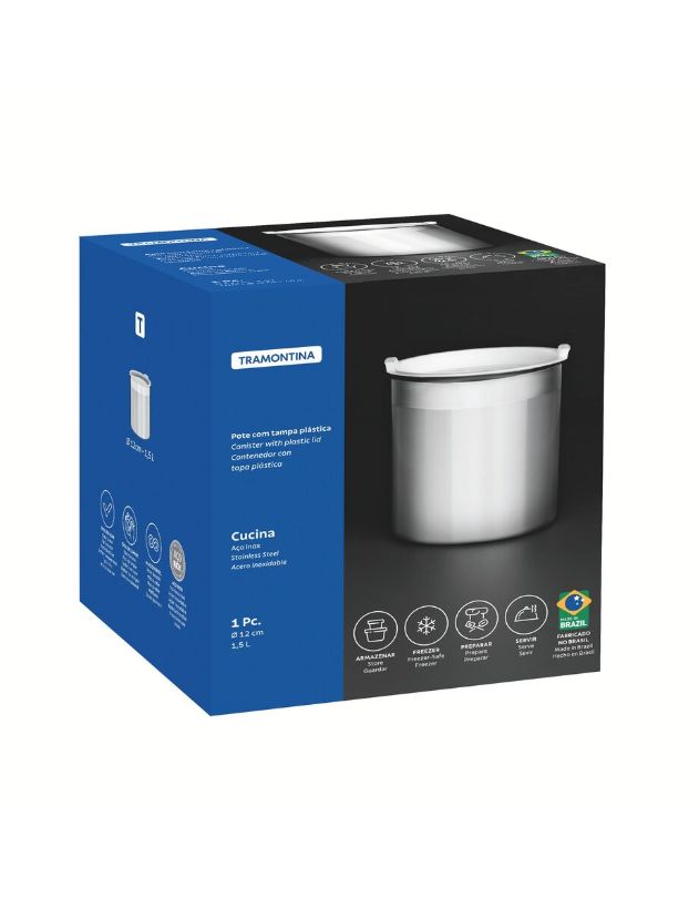 Pote fabricado em aço inox de alta qualidade com tampa plástica, capacidade de 1,5 litros, diâmetro de 12cm. Perfeito para armazenar molhos, cremes e caldos em ambientes domésticos ou comerciais. Cor inox e tampa translúcida. Tags: pote inox, molheira, Tramontina, utensílio de cozinha, armazenamento, 1,5L.