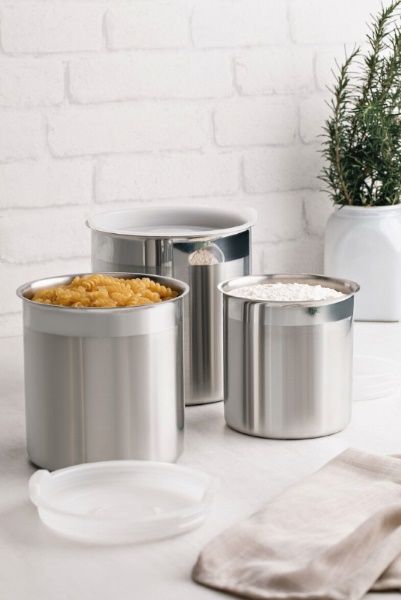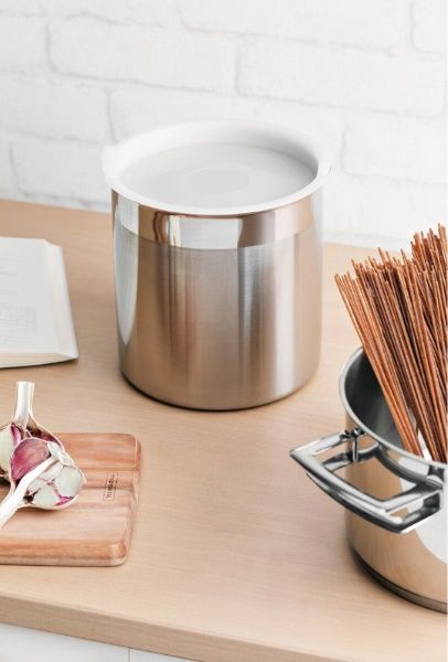 Pote molheira de inox com tampa plástica 1,5L Tramontina, ideal para armazenar e servir molhos e caldos.