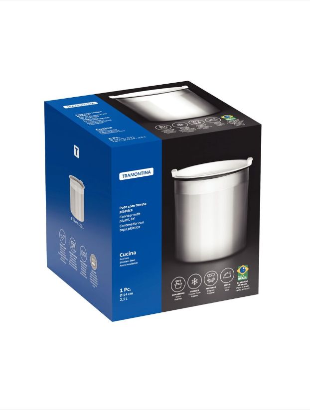Pote molheira Tramontina produzido em aço inox de alta qualidade com tampa plástica, garantindo conservação e higiene. Capacidade de 2,3 litros, 14 cm de diâmetro, ideal para armazenar e servir molhos, cremes ou alimentos líquidos. Uso doméstico ou profissional. Cor: inox com tampa transparente. Tags: pote, molheira, recipiente, armazenamento, inox, tampa plástica, cozinha, Tramontina.