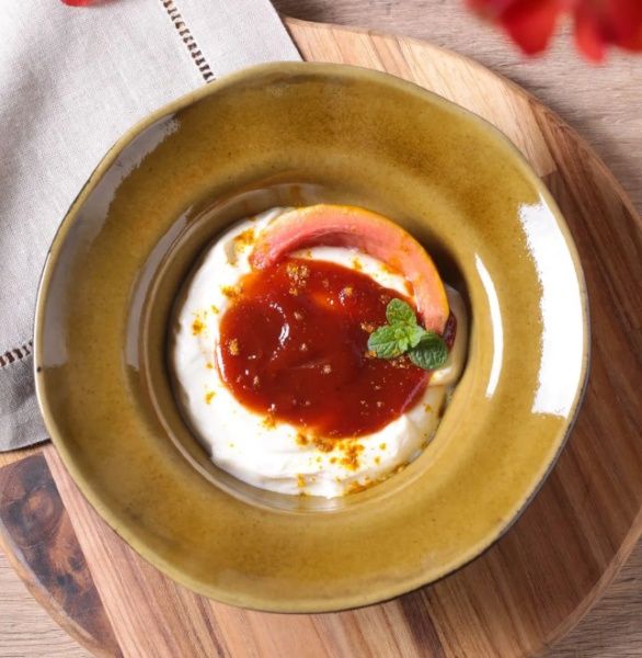 Prato de apresentação em cerâmica, ideal para servir entradas ou pratos principais com elegância. Diâmetro 19cm, cor âmbar.