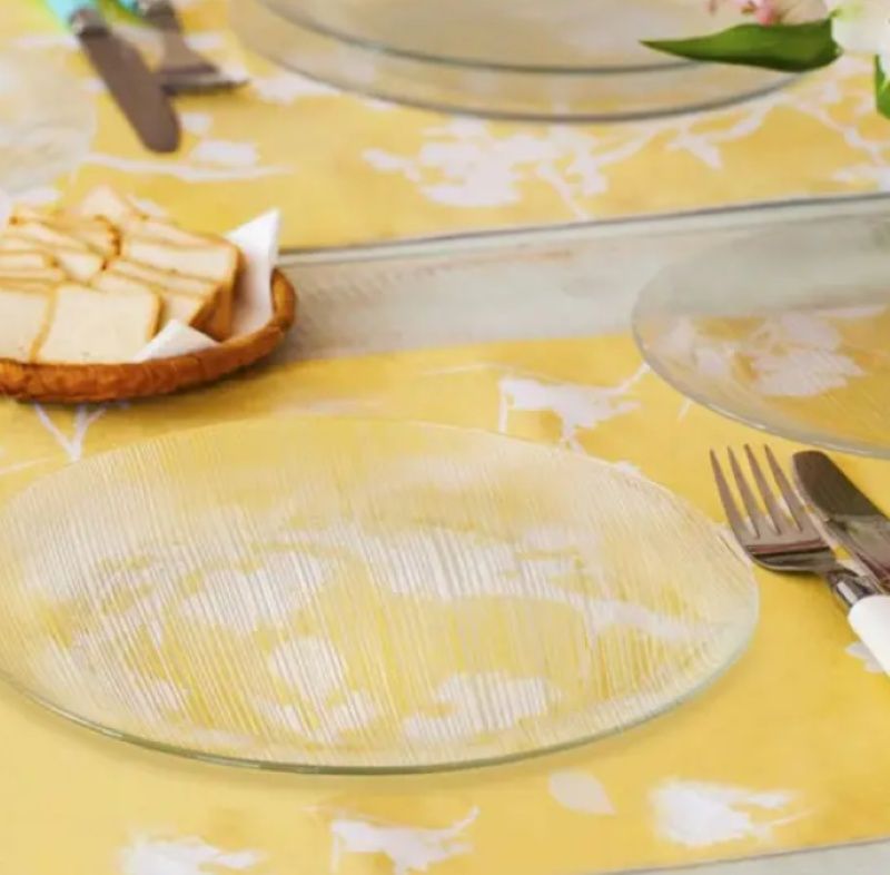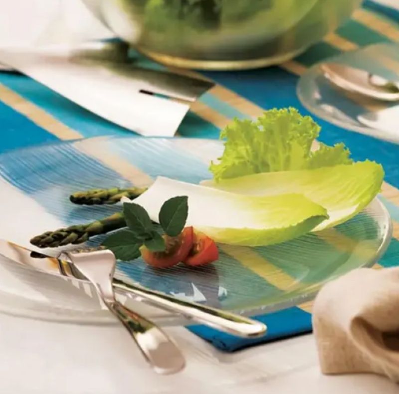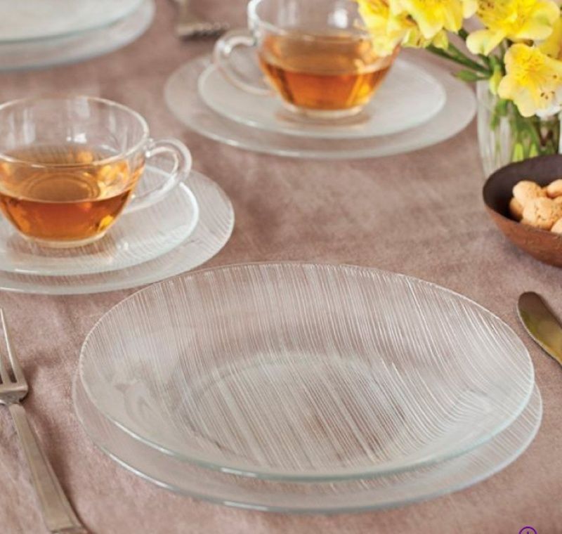 Prato raso de vidro transparente, formato clássico, ideal para servir refeições. Caixa com 24 unidades. Diâmetro de 23 cm.