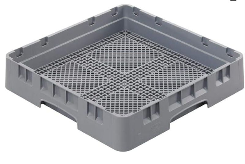 Cesta organizadora Cambro em polipropileno resistente, ideal para lavagem e armazenamento de talheres em cozinhas industriais, restaurantes e buffets. Suporta lavagem em altas temperaturas, fácil empilhamento, resistente a produtos químicos. Dimensões aproximadas: 50 x 50 x 10 cm. Cor cinza. Tags: rack de talheres, cesta Cambro, suporte para lavagem, organizador de talheres.