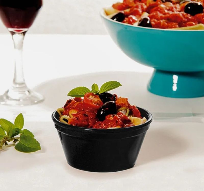Ramekin plástico redondo 150ml na cor preta, ideal para servir porções, molhos e sobremesas.