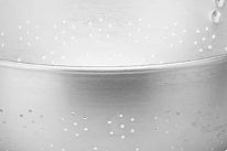 Tacho escorredor em alumínio, furo grosso, 60cm, ideal para escorrer massas, legumes ou alimentos fritos em grandes volumes.
