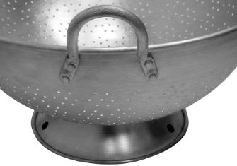 Tacho alumínio com furo grosso e pés, 45cm. Ideal para escorrer alimentos ou frituras em grandes volumes.