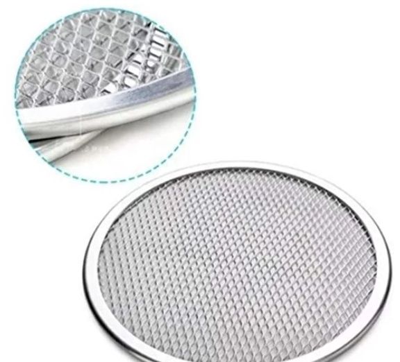 Tela para pizza reforçada em alumínio, 25cm, ideal para assar pizzas uniformemente.
